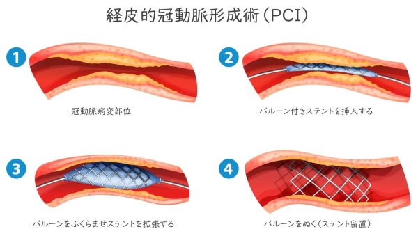 PCIとは冠動脈閉塞部位の血管を拡張し血流を改善させる治療のことです。
