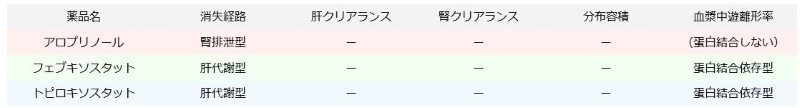 薬物動態情報から分かることは、アロプリノールは腎排泄型、フェブキソスタットとトピロキソスタットは肝代謝型の薬剤ということです。