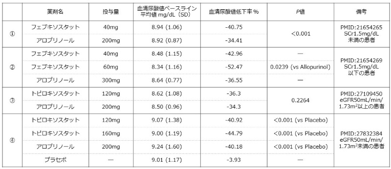 あと一応記載しておくと、日本では尿酸生成抑制薬の適応は痛風・高尿酸血症です。フェブキソスタットは米国、欧州、韓国では「痛風患者における高尿酸血症」、カナダでは「痛風患者における血清尿酸値の低下」の効能・効果で承認を得て5)いて、ただ尿酸値が高いだけでは適応がありません。